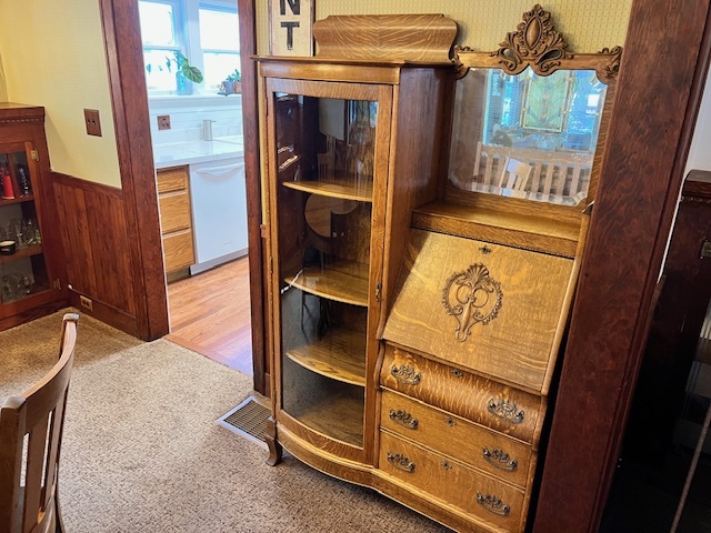 Hoosier Style Kitchen Cabinet, Curved Glass Oak Secretary