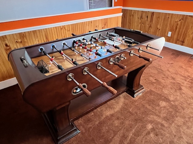 FUNITURE: Sectional Sofa, 60” Samsung Curved TV, Foosball Table, Bedroom Furniture, Pub Table w/Stools, Patio Furniture, Fire Pit Table, Lifetime Plastic Picnic Table, Mission Style Loung Chairs