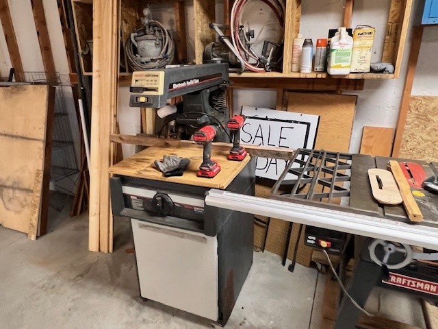 TOOLS: DR 40 Volt Battery Powered Lawn Mower, Craftsman 10” Table Saw, Craftsman Radial Arm Saw, Pressure Washer, Trailer Dolly, 4” Belt Sander, Airless Paint Guns, Work Lights, Floor Creeper, Engine Stand, Floor Jacks/Stands, MISC.: Games/Puzzles.......& MUCH MORE!